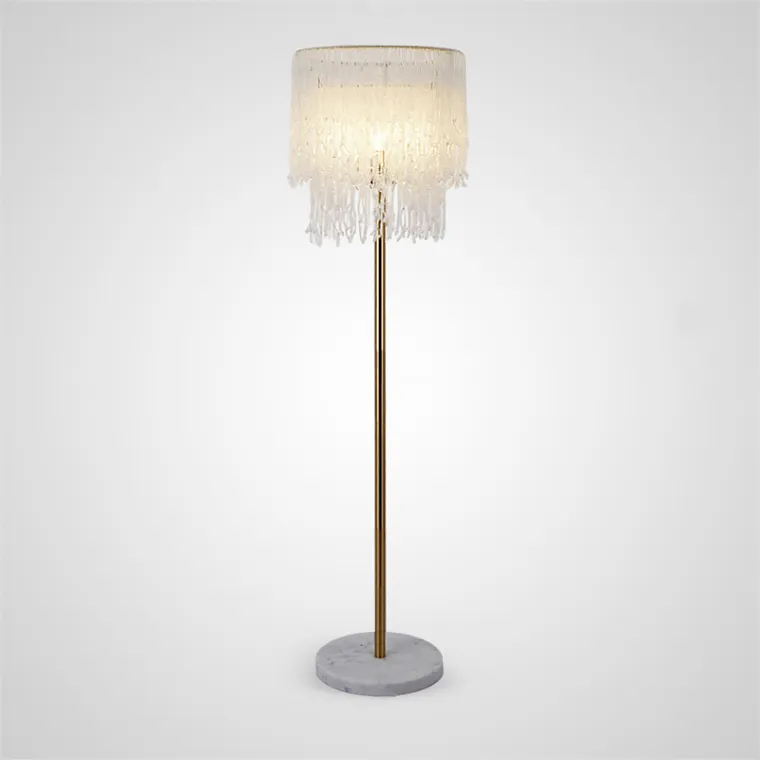 Напольный светильник с двухъярусным абажуром из подвесок, собранных из круглых и каплевидных хрустальных бусин