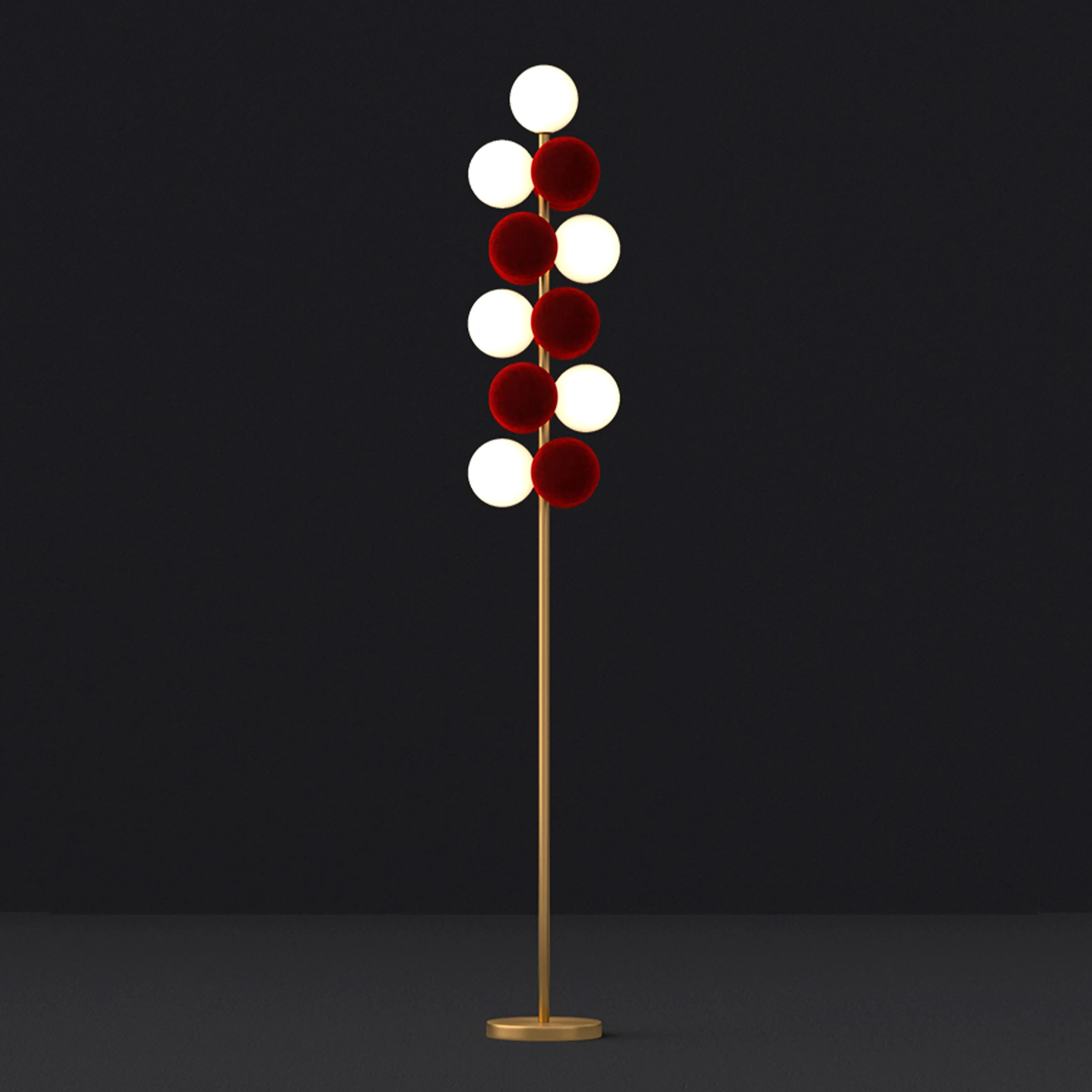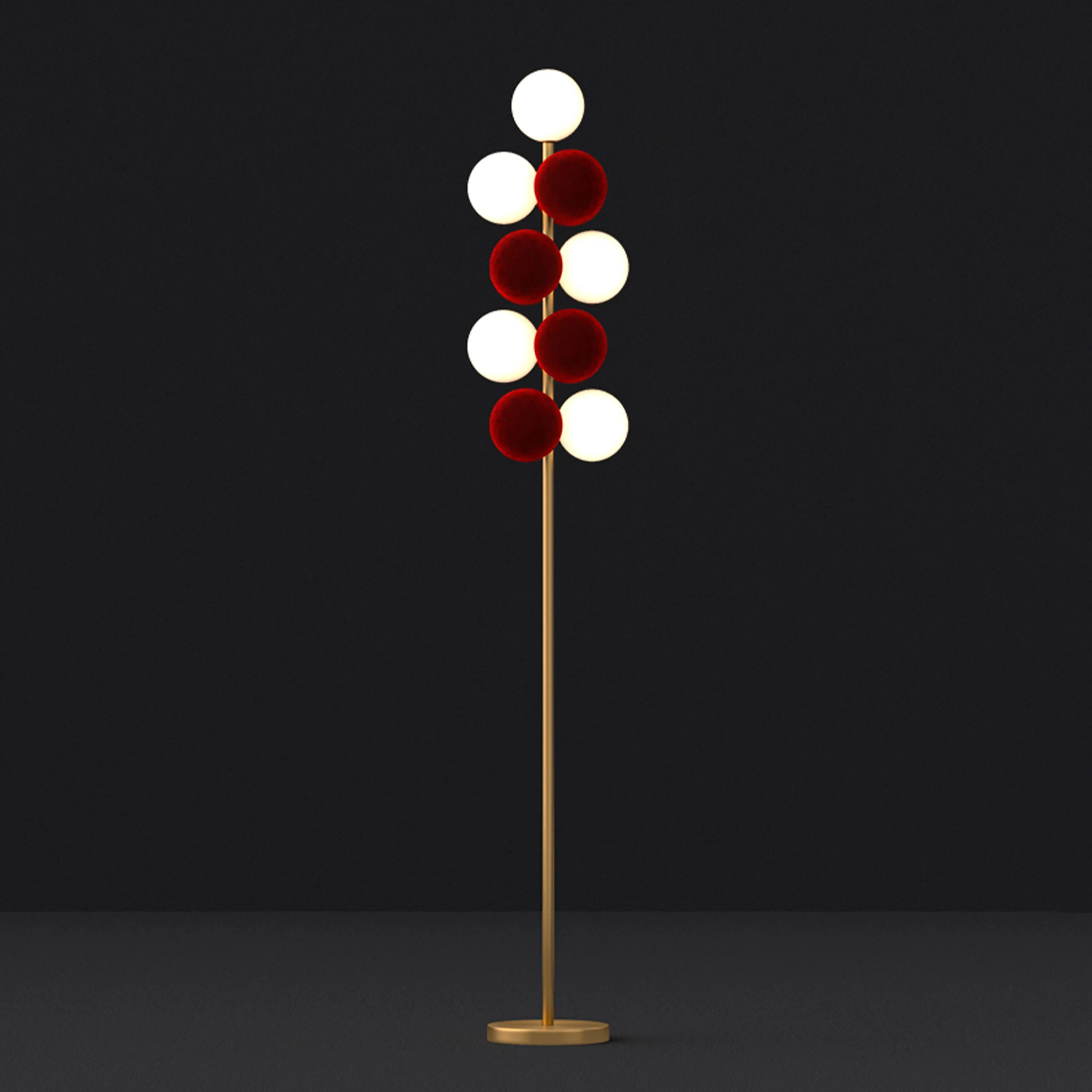 Особенность этого торшера заключается в комбинации шарообразных плафонов из матового молочного стекла, которые создают мягкий, рассеянный свет. А декоративные флокированные шарики трех цветов - кофе, бордо и черные - делают его не просто функциональным, но и стильным элементом интерьера.