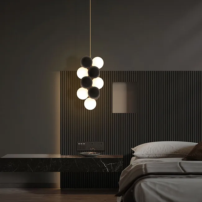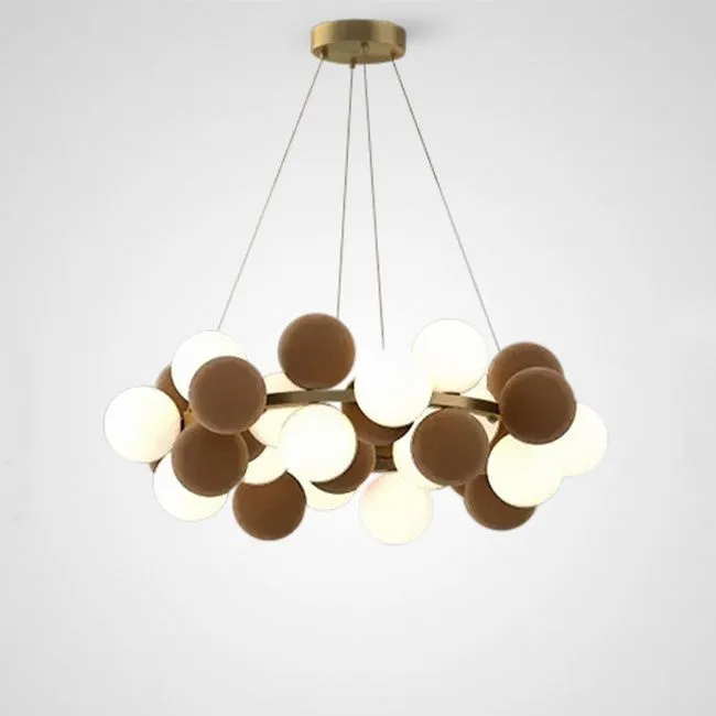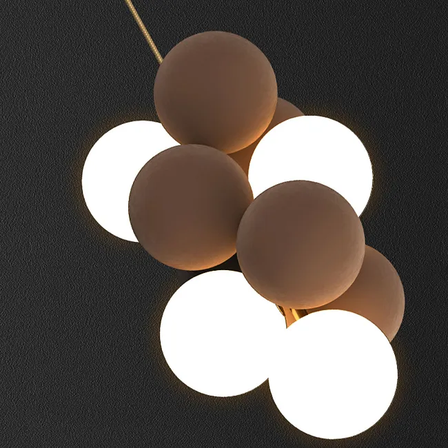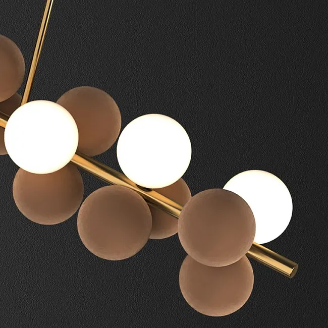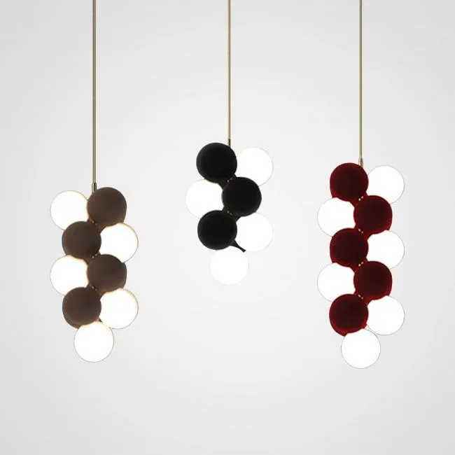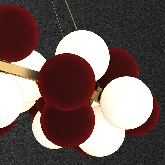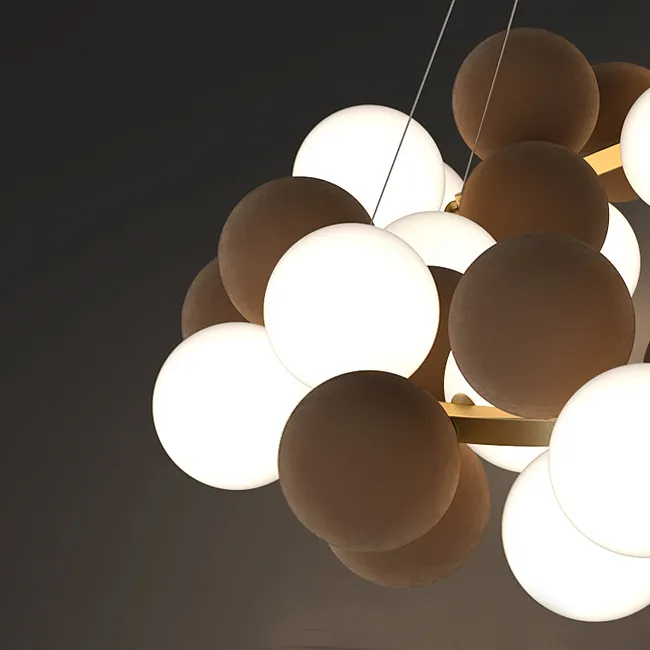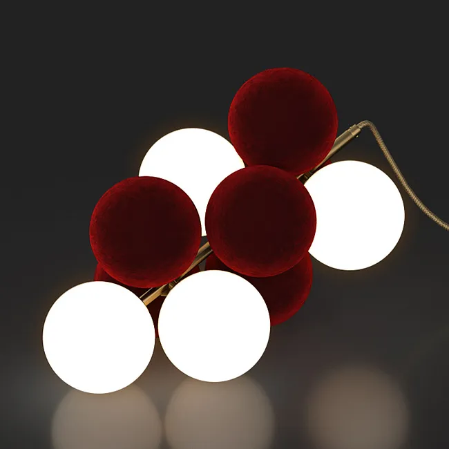 Особенность этого торшера заключается в комбинации шарообразных плафонов из матового молочного стекла, которые создают мягкий, рассеянный свет. А декоративные флокированные шарики трех цветов - кофе, бордо и черные - делают его не просто функциональным, но и стильным элементом интерьера.