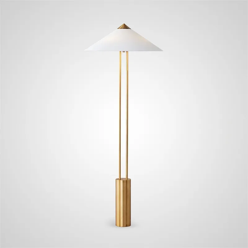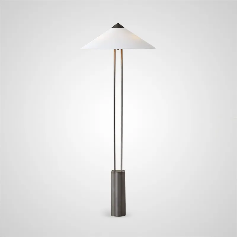 Серия дизайнерских торшеров с текстильным абажуром конической формы на двойной стойке с цилиндрическим основанием