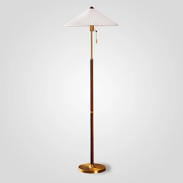 Напольный светильник с деревянной стойкой на металлическом основании и плиссированным абажуром конической формы