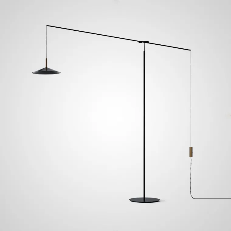 Торшер с подвижным штативом и металлическим плафоном конической формы на подвесе