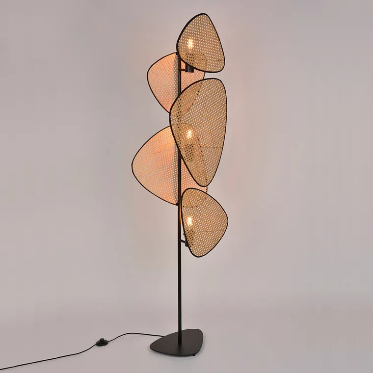 Напольный светильник с разноуровневыми треугольными рассеивателями из бамбукового плетения