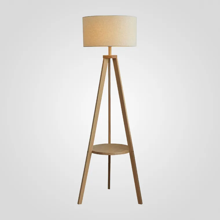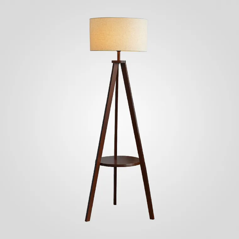 Торшер в виде деревянной треноги с круглым абажуром и встроенным журнальным столиком
