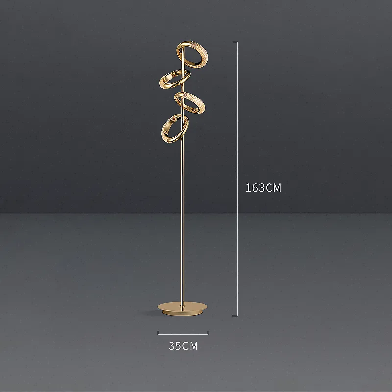 Размер основания составляет Ø 35 см, что обеспечивает надежность и устойчивость торшера. Форма плафона представляет собой кольцо, а прозрачный цвет плафона красиво сочетается с золотым каркасом, что создает роскошный и элегантный вид.