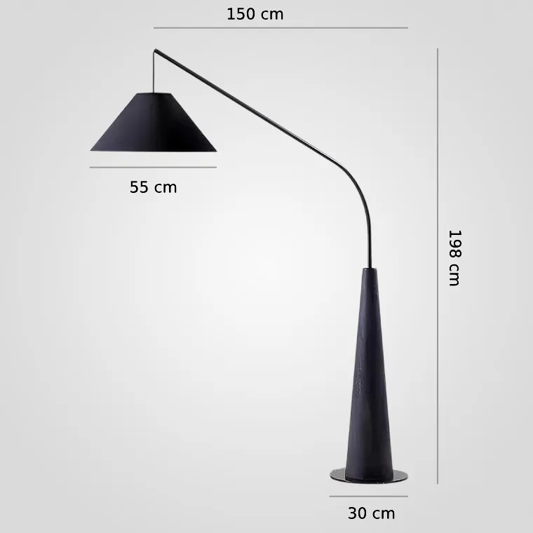 Торшер удочка с деревянным основанием конусом и изогнутым металлическим корпусом, дополненный текстильным абажуром
